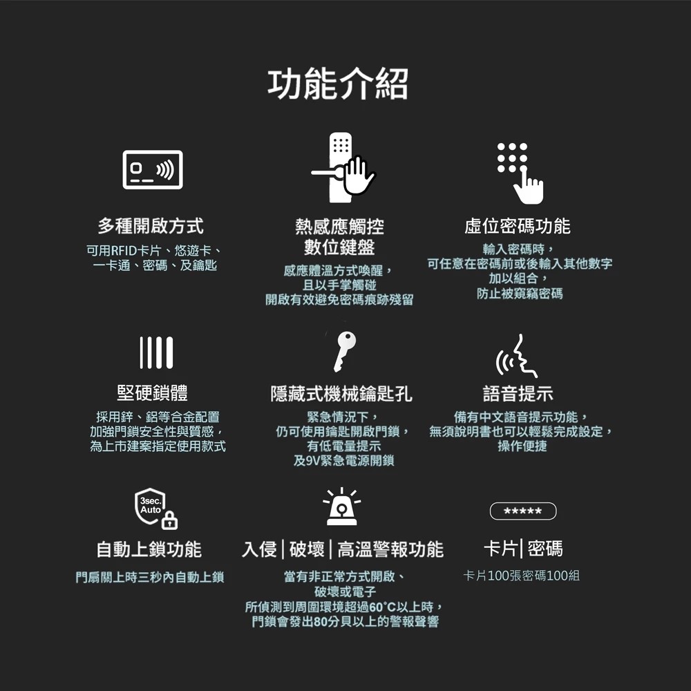 | 備用緊急開啟方式 | 9V 緊急後備電源啟動電源 |